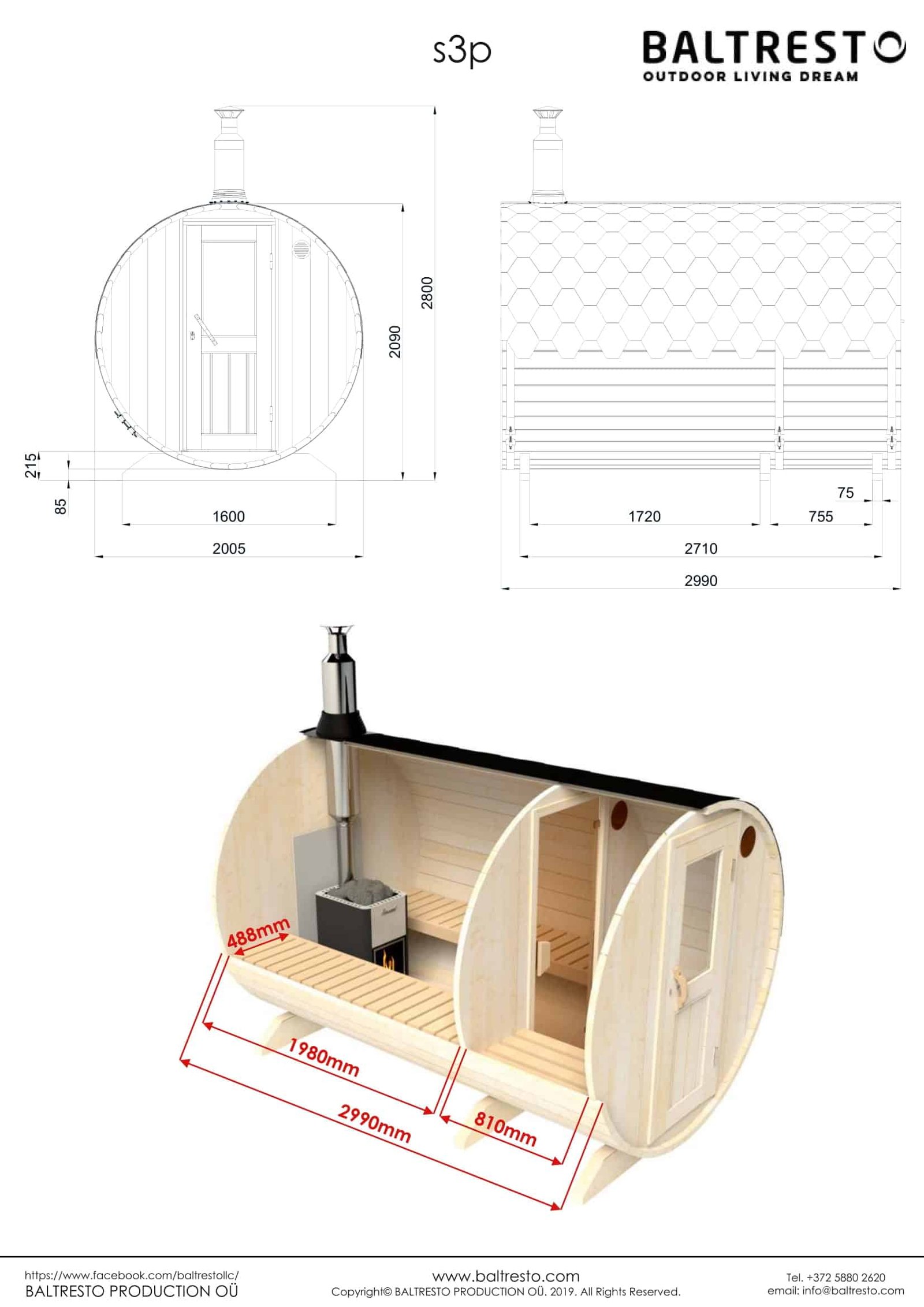 The compactness, functionality, and mobility of our 3 meter long – 4 person Outdoor Barrel Sauna with Change Room (S3P) will give you unlimited freedom to choose where it perfectly fits in your backyard or outdoor space! The price includes the Barrel Sauna Kit only. You are welcome to choose from a wide variety of our Electric or Wood Burning Heaters which will be perfect in your Barrel Sauna.