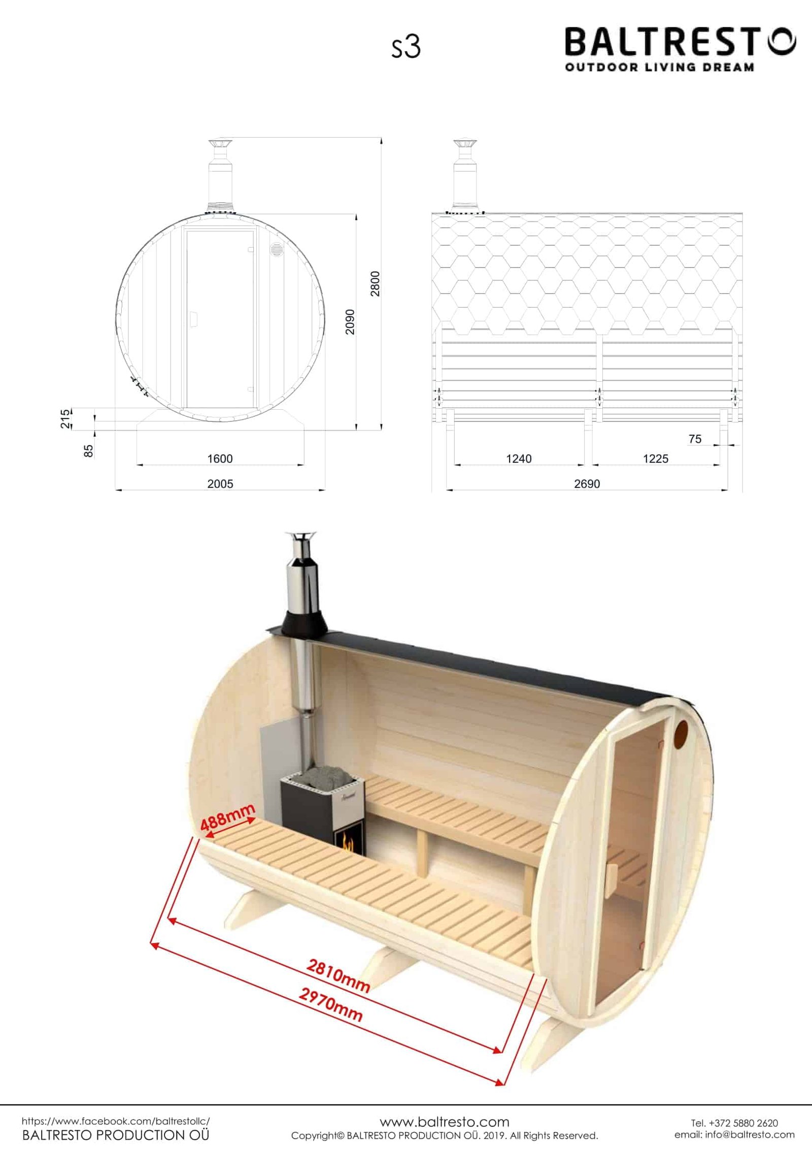 The compactness, functionality, and mobility of our 3 meter long – 6 person Outdoor Barrel Sauna (S3) will give you unlimited freedom to choose where it perfectly fits in your backyard or outdoor space! Price includes the Barrel Sauna Kit only. You are welcome to choose from a wide variety of our Electric or Wood Burning Heaters which will be perfect in your Barrel Sauna.