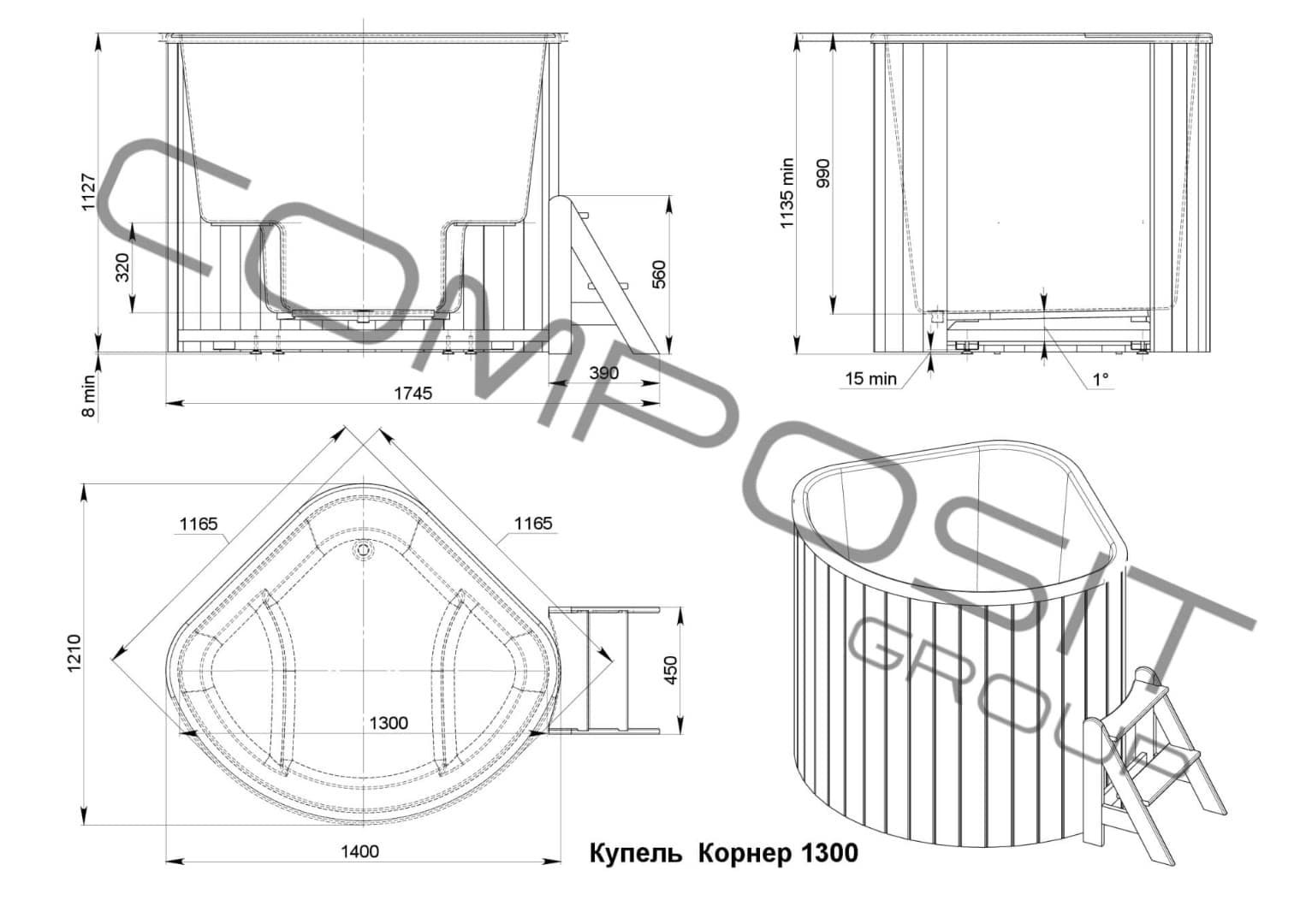When used outdoors, it is recommended to additionally equip the plunge tub with an outer water-heating solid-fueled boiler with a capacity of 25 or 45 kW.