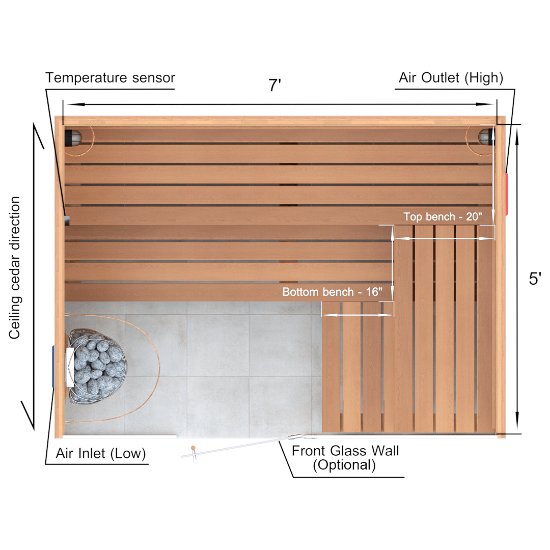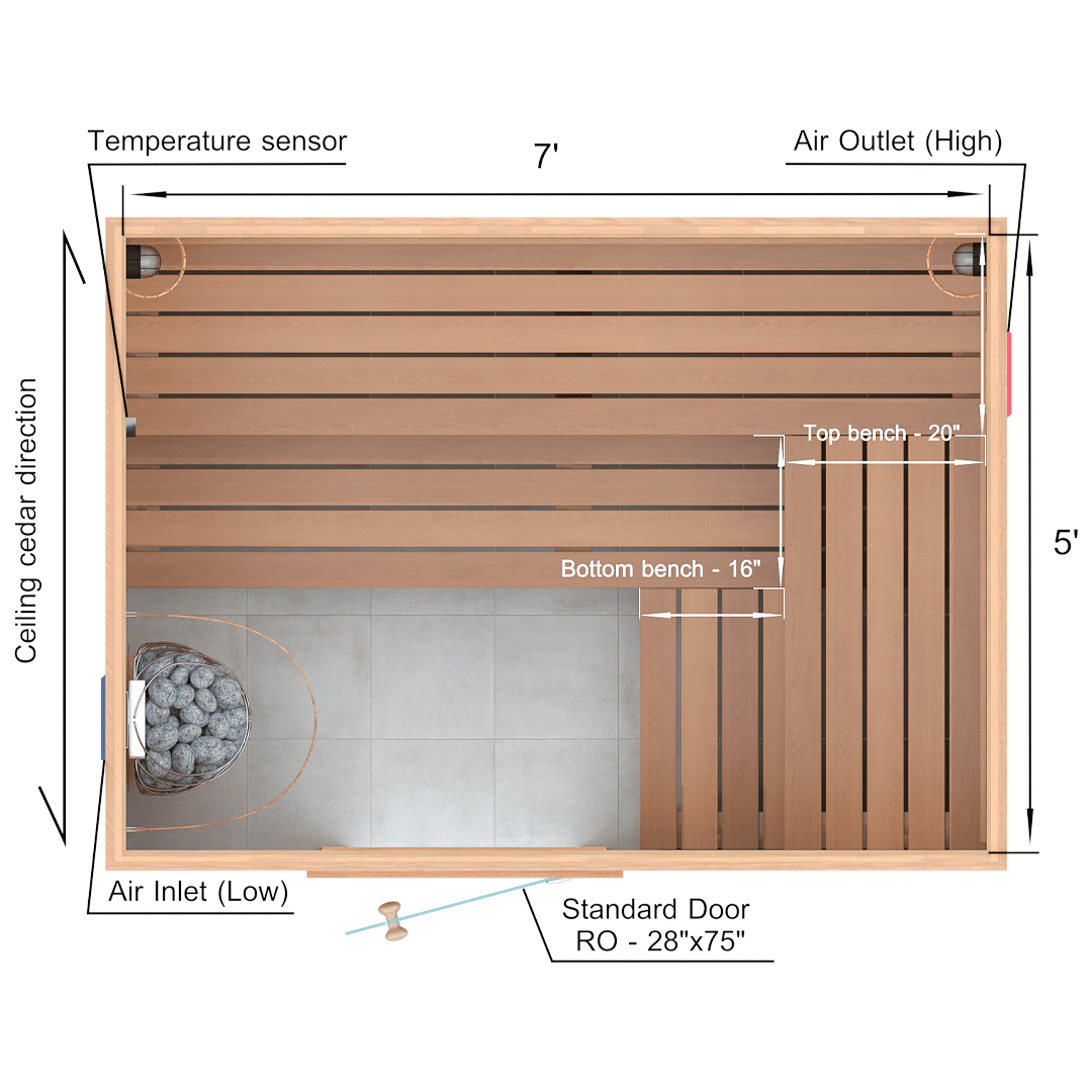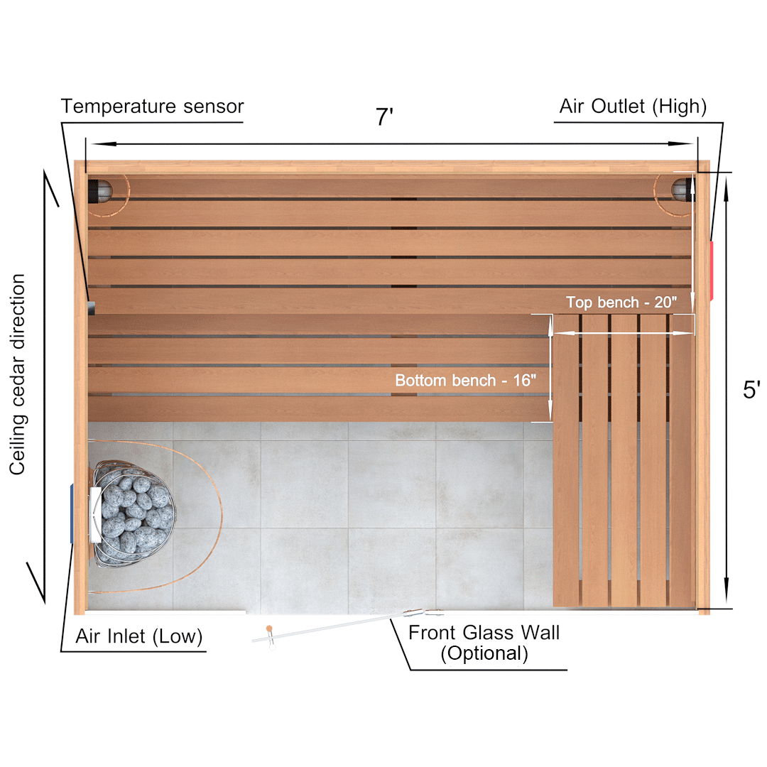 A sauna kit includes all of the material for the walls, ceiling and benches. In 5x7x7 Custom Western Red Cedar Sauna Kit we supply: