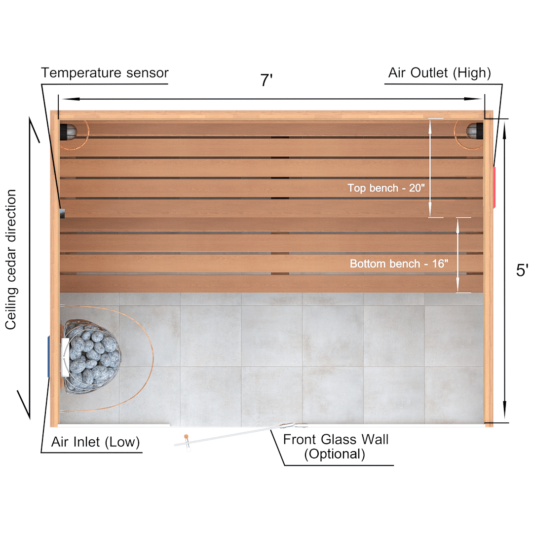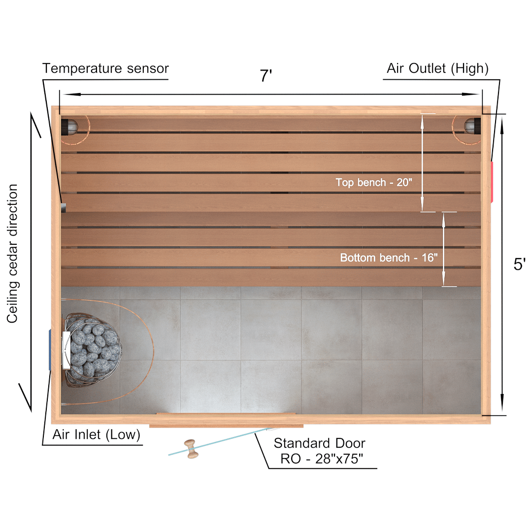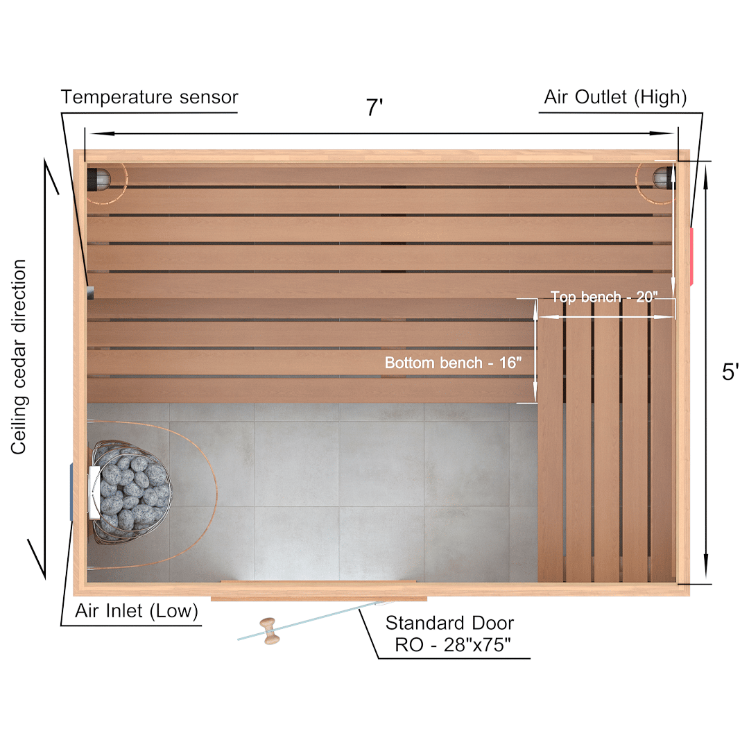 A sauna kit includes all of the material for the walls, ceiling and benches. In 5x7x7 Custom Western Red Cedar Sauna Kit we supply: