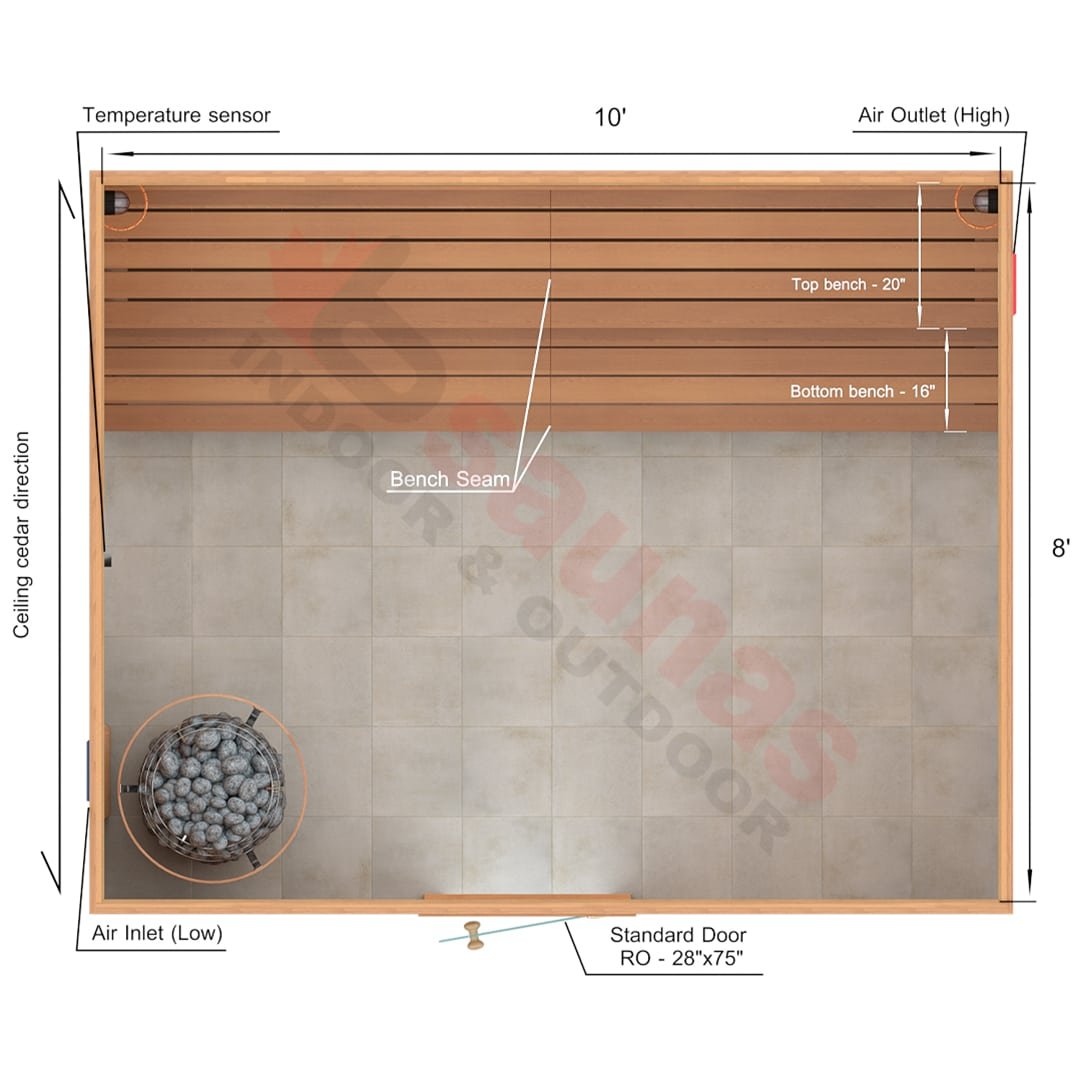 A sauna kit includes all of the material for the walls, ceiling and benches. In 8x10x7 Custom Western Red Cedar Sauna Kit we supply: