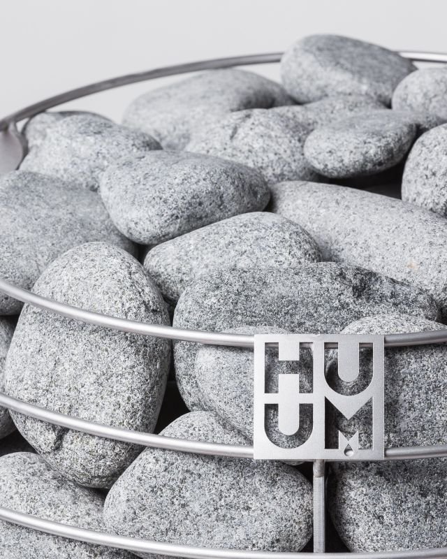 Throwing water on the stones is how you regulate heat and steam in the sauna. The shape, size and composition of the stones and the way they are arranged make all the difference. We recommend rounded stones because they provide a milder steam. Thanks to the rounded shape the water can reach inner layers of stones and evaporate gradually instead of evaporating all at once from the top layer. Since they are very visible in HUUM heaters, you need both smaller and bigger stones to avoid big noticeable gaps. We also suggest laying smaller stones and more close together on the top to accumulate the heat better.