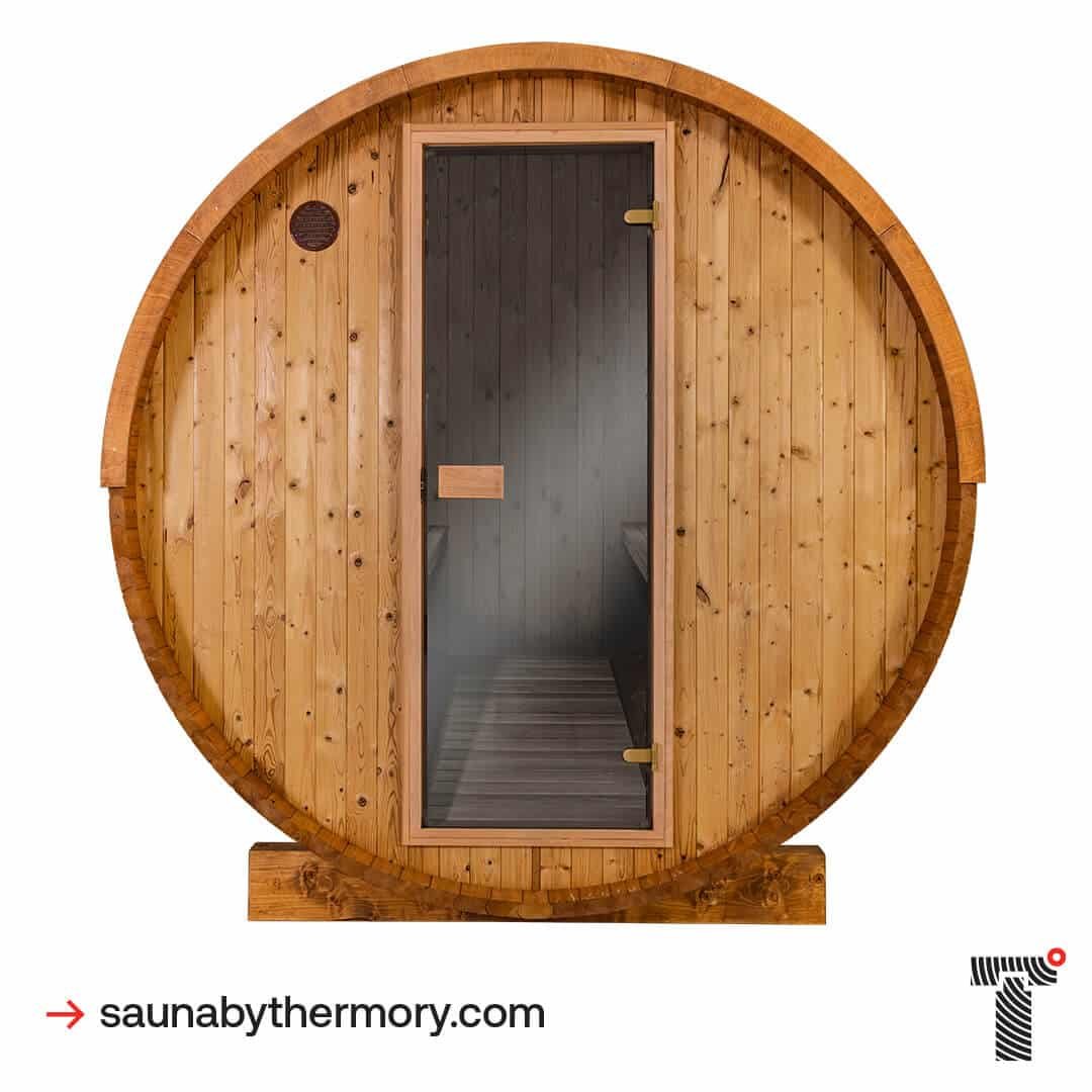6-person, premium-quality DIY Barrel Sauna Kit. Natural light from the glass door illuminates this beautiful space. Includes comfortable benches for added convenience. Quality materials and superb engineering make this the very best outdoor sauna.